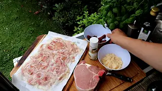 Zutaten: 1 Schweinekotelett ca. 5cm dick 60g gehobelter Parmesan getrocknete Tomaten Olivenöl Salz / Pfeffer 150g Pancetta (dünn geschnitten)