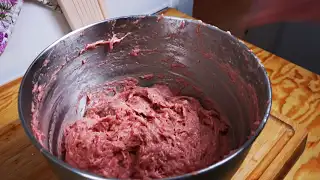 In einer Schüssel Fleisch, Gewürzmischung, Stärke und Backpulver mit der Hand trocken grob durchschmischen. Dann portionsweise das Wasser zugeben und dazwischen immer sauber unterkneten. Je nach Wunsch das Ganze mit etwas Lebensmittelfarbe rötlich färben. Nach ca. 7-8 min. gründlichem Kneten ist das Brät fertig. Geht auch mit Küchenmaschine und Knethaken.