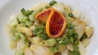 5 Stangen Spargel 1 Frühlingszwiebel Estragon ½ Blutorange (oder Orange , Limette oder Zitrone) Senf Agavendicksaft oder Honig Pflanzenöl Meersalz Pfeffer